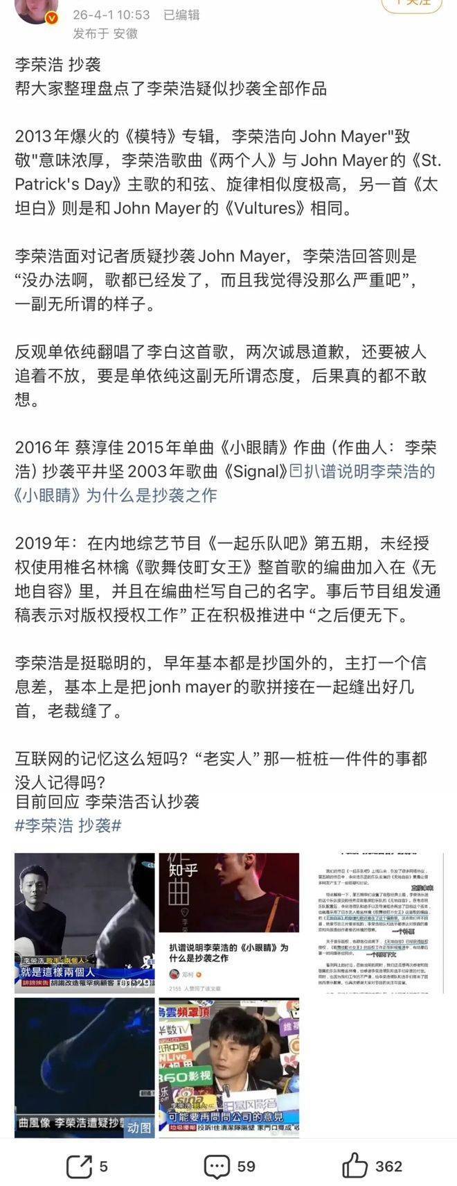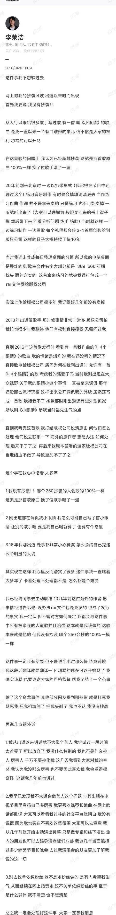 更令人震惊的是,网友扒出李荣浩3月底刚高调控诉单依纯未获授权翻唱《李白》,当时他强调“原创尊严不容侵犯”,如今面对自身争议却用“通用乐理”辩解,这种反差让公众质疑其维权双标,旧案《小眼睛》抄袭平井坚作品的疑云也被重提。